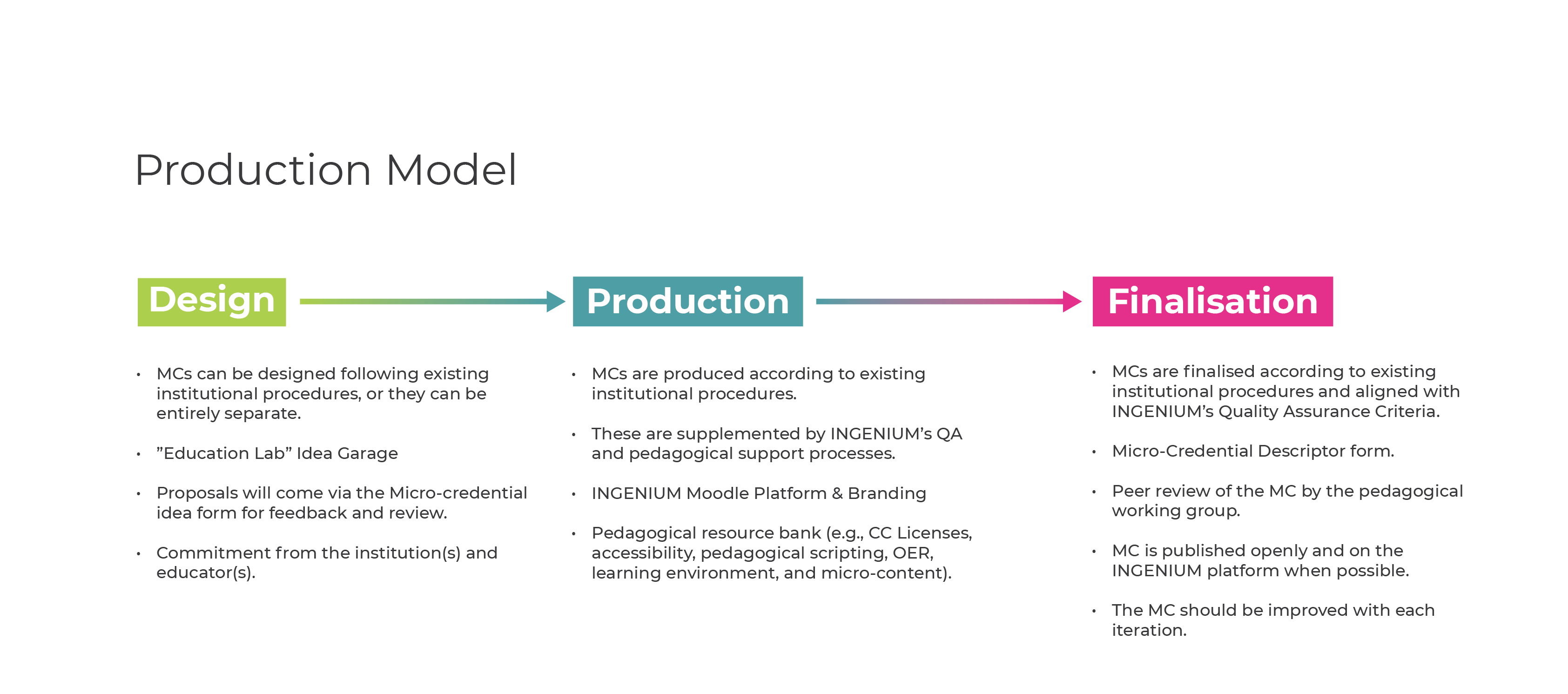 To create INGENIUM Micro-Credentials, we follow a structured process to ensure all quality and consistency across all INGENIUM Micro-Credentials so that all INGENIUM Micro-Credentials have this common look, feel, and substance.