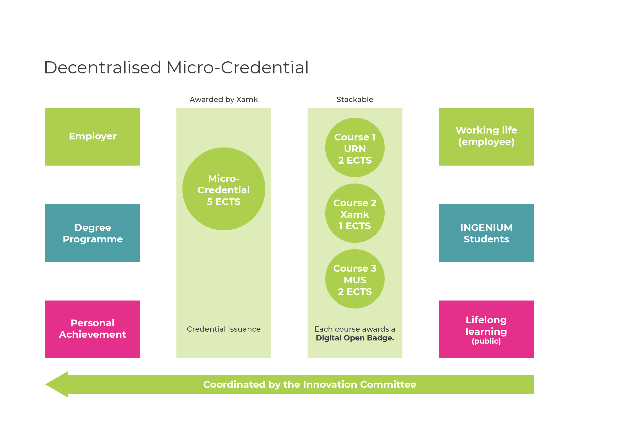 - This model consists of several stackable, independent courses from different INGENIUM partners, which lead to the issuance of a single, larger Micro-Credential.